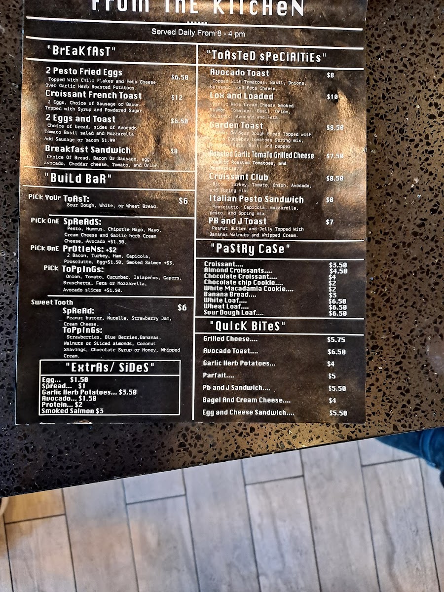The food offerings include a range of freshly prepared sandwiches, such as the Croissant Club, Bacon and Egg Croissant, and the Italian Pesto Sandwich. There are also items featuring bagels and sourdough bread, including the Breakfast Sandwich on Sourdough and the Lox and Loaded option. Additional savory choices like the Fried Pesto Eggs provide a breakfast-oriented selection with accompanying sides.